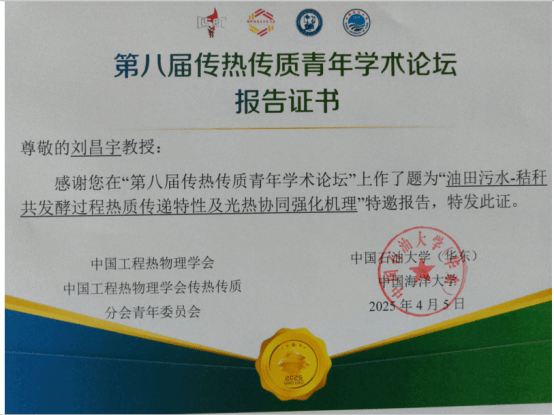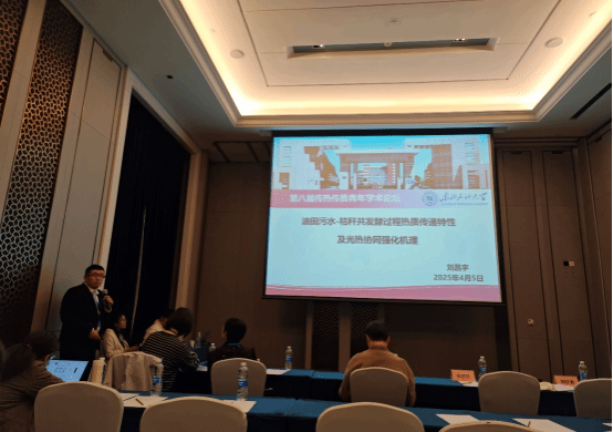 开幕式上,中国石油大学(华东)党委副书记马国顺及中国工程热物理学会第八届传热传质分会主任张兴教授分别致辞,向与会代表致以热烈欢迎,并对当前传热传质领域的发展趋势与挑战进行了展望。论坛期间,刘昌宇教授作题为《油田污水-秸秆共发酵过程热质传递特性及光热协同强化机理》的特邀报告,全面展示了公司在能源与环境交叉领域的研究成果与技术进展,获得现场专家学者的广泛关注与积极反响。吴洋洋副教授、杨瑞桐博士在专题研讨环节与多位领域专家进行了深入交流,围绕复杂传热过程模拟、传质机理揭示、新型热控材料应用等热点议题展开探讨,进一步拓展了合作与研究思路。